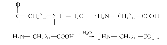 月桂內(nèi)酰胺在鹽酸、硫酸、硼酸或己二酸等酸催化劑存在下,進(jìn)行水解開(kāi)環(huán),生成00-氨基十二酸,再經(jīng)縮聚得尼龍12。反應(yīng)式如下: