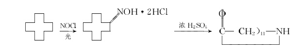 2)光亞硝化法以環(huán)十二烷為原料,在高壓汞燈的照射下,使環(huán)十二烷和氯化亞硝酰反應(yīng),得到環(huán)十二酮肟鹽酸鹽,再用濃硫酸經(jīng)貝克曼分子重排,得到月桂內(nèi)酰胺。反應(yīng)式如下: